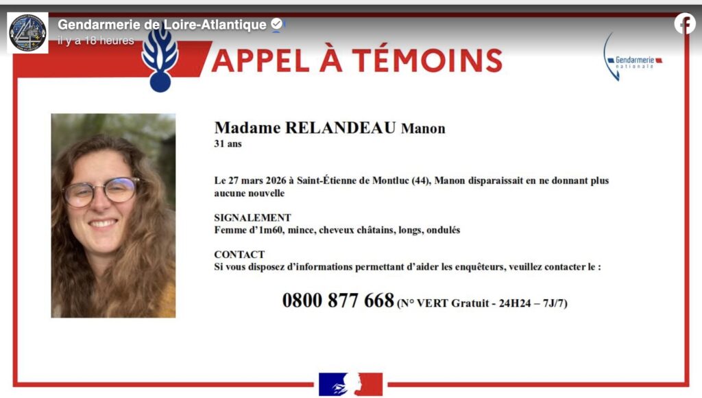 Ce mercredi 22 avril, la gendarmerie de Loire-Atlantique a publié un appels à témoins pour retrouver Manon Relandeau.